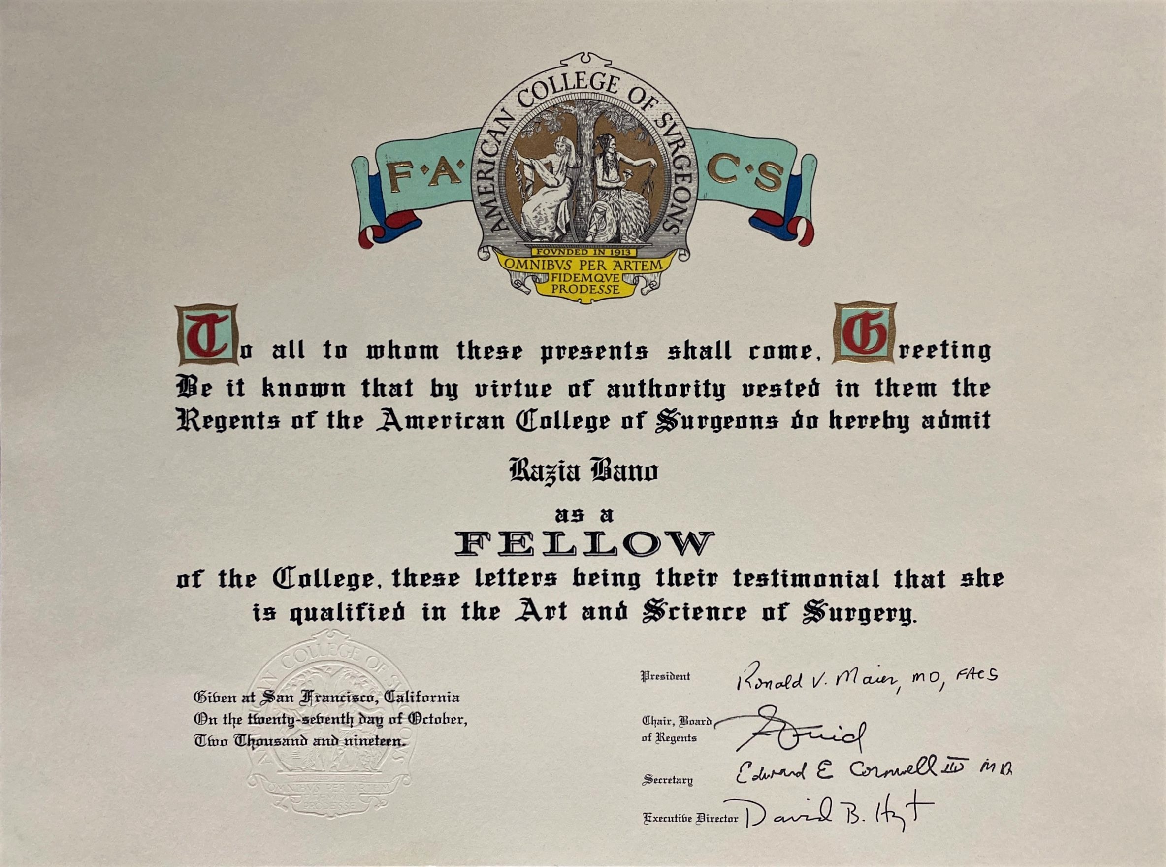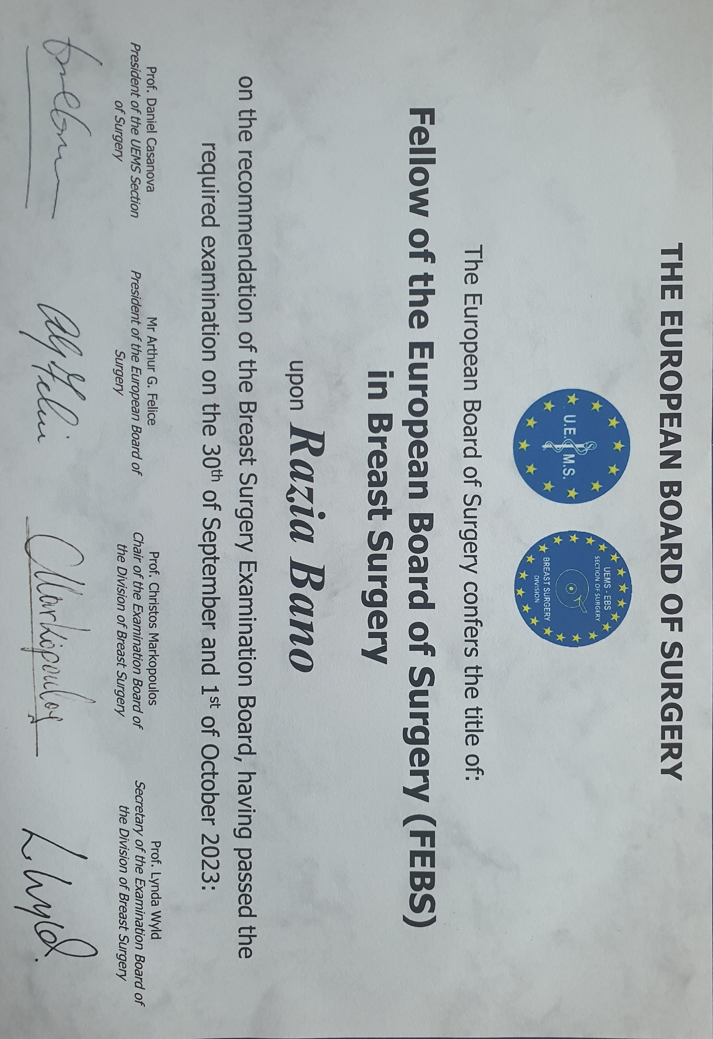 I obtained fellowship from American College of Surgeon (FACS ) in 2019 , I am fellow of Royal College of Surgeons Glasgow (2019) . I completed my fellowship of European Board of Breast surgery in 2023 .