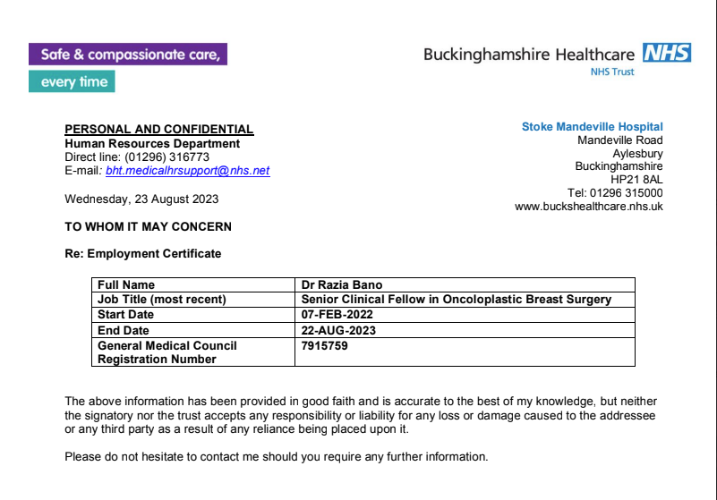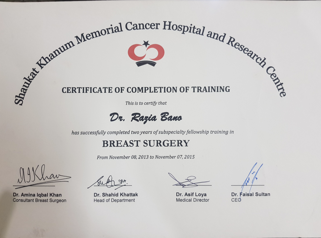 After completing various workshops from UK & USA including ultrasound for surgeons, stereotactic biopsy, medical tattooing, and Oncoplastic & Reconstructive Breast surgery hands-on workshops. I felt the need of complex oncoplastics training as many patients were candidates of partial mastectomy or complete mastectomy. Therefore I moved to the UK for further training in reconstructive and cosmetic breast surgery 2022-2023. I completed my fellowship in oncoplastic and reconstructive breast surgery in August 2023 from NHS .